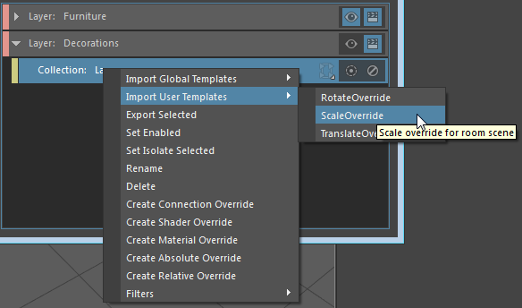 Right-click a layer, and only templates of type collection are listed in the menu. Override templates, for example, are not listed here. A subfolder RoomSceneTemplates exists inside the global templates directory, and thus a submenu is created accordingly.