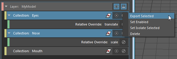 To export a collection or override, select the item and select File > Export Selected. You can optionally add comments to the Notes field.