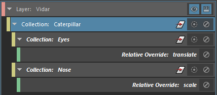 These two collections are then imported as subcollections of the Caterpillar parent collection, and their associated overrides imported also. This way, the caterpillar model appears in the layer, and its eyes can be translated and its nose scaled.