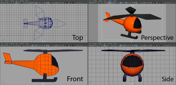 By default, Maya has four cameras that let you view your scene in a panel: the perspective camera and the three orthographic cameras (side, top, front) that correspond to the default scene views. You look through these cameras (panels) as you model, animate, shade, and texture objects. To switch among these cameras, open the Panels menu and select a camera from the Perspective or Orthographic submenu.