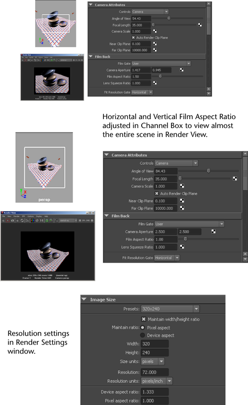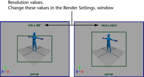 The dimensions of the Resolution Gate represent the rendering resolution (the region to be rendered). The rendering resolution values are displayed above the Resolution Gate in the view. You can change these dimensions in the Image Size section of the Render Settings window.