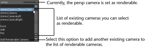 The second and third sections list existing cameras that you can select as renderable, for example, stereo cameras and the front and side cameras.