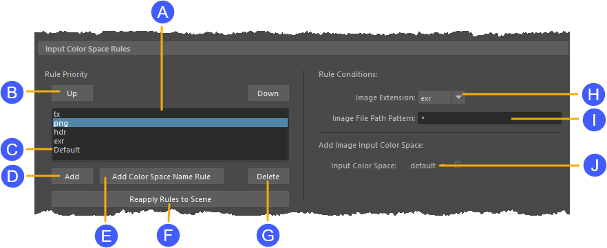 The input space specified by the Default rule is used when no other rule matches. You can only specify the input color space — you cannot specify a condition to match. The Default rule is always the last in the list and cannot be moved.