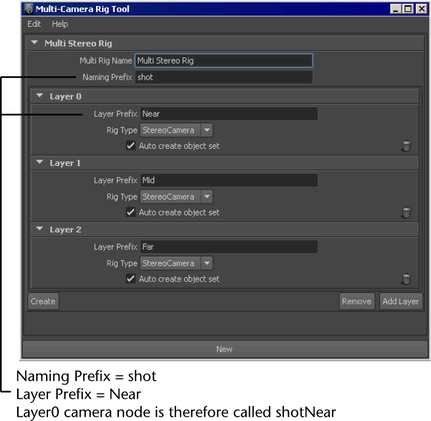 Enter a naming prefix for your multi-camera rig and for each layer. The main node for each layer will have the name <Naming Prefix Layer Prefix>. For example, by default, Layer 0 has the name shotNear.