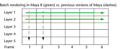 In order to properly support the use of different renderers with different layers in Maya 8, rendering from the command line (render) renders all frames of a particular layer before moving on to the next layer, as seen in the following diagram.