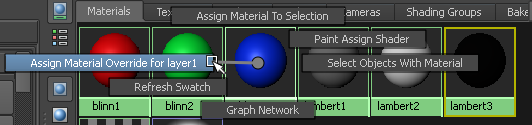 Hypershade, or create a new material. To assign this material to the layer, select the layer and middle-drag the material swatch over the object.
