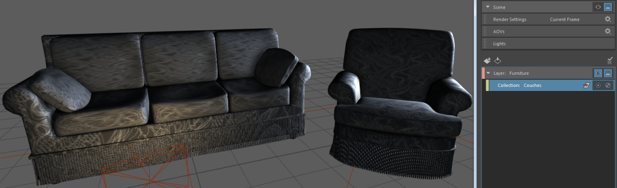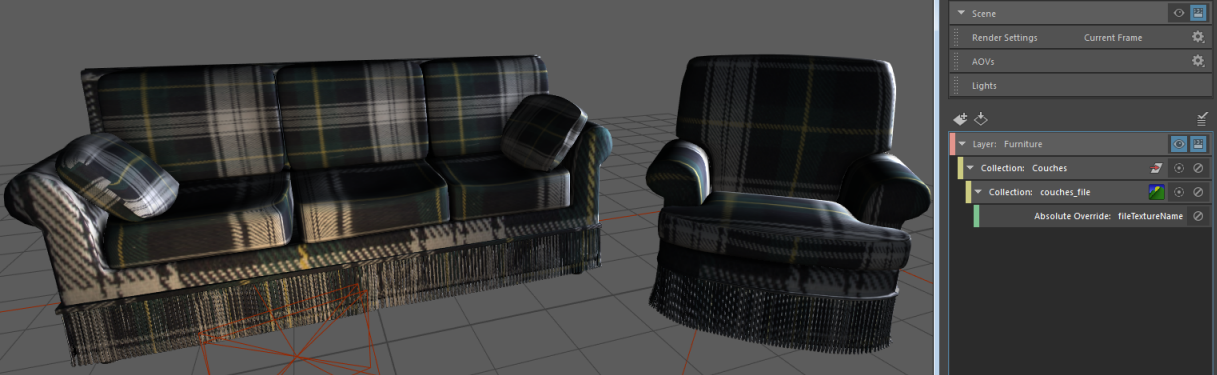 In this example, the couches are assigned to a lambert, which is mapped to a greyish texture. To assign the couches to a plaid texture instead, you can do as follows: