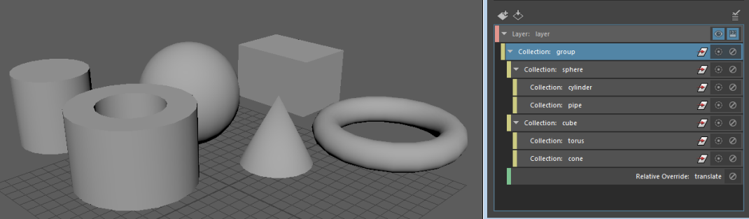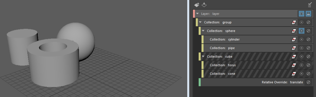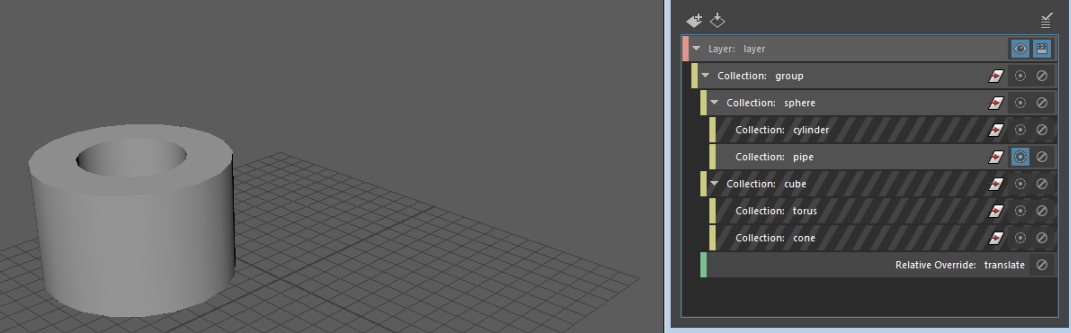 In this example, when you isolate select the pipe collection, only the pipe appears in the viewport. The sphere parent collection remains enabled, but the sphere that it contains does not appear in the viewport. This allows overrides on the parent collection (in this case the Translate override that is applied to the group collection), to remain applied to the pipe collection.