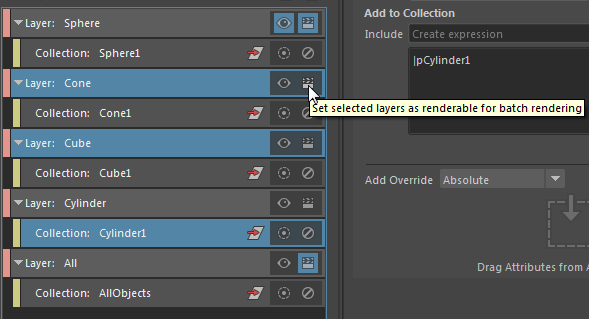 sets the Cone and Cube layers to be renderable. The Cylinder layer remains non-renderable as only its collection is selected, and not the layer itself.