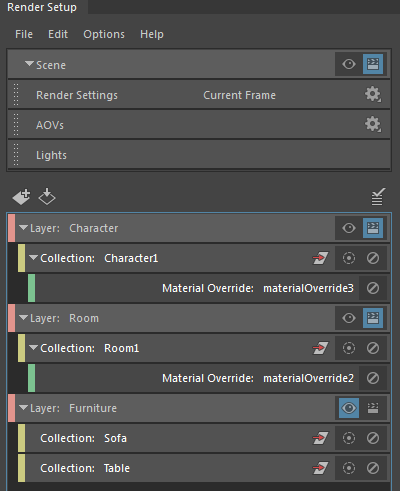 In this example, the masterLayer, Character and Room layers are rendered during batch render as they are denoted as renderable by the