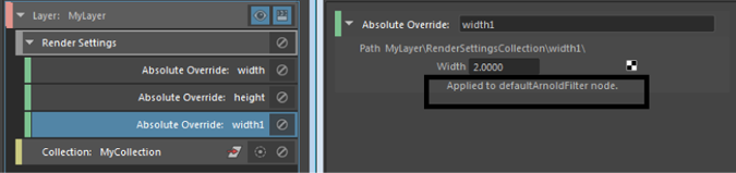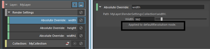 Select any Render Settings override, and the Property Editor indicates the node to which it is applied; for example: Applied to defaultResolution node.This indicator appears on all Render Settings overrides created since Maya 2017 Update 3.