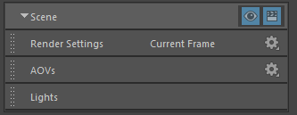If you open the Render Settings while you are viewing the scene layer, the scene Render Settings are shown. If you are viewing any of the layers; for example, layer1, then the Render Settings for layer1 are shown. The same applies for AOVs and Lights.