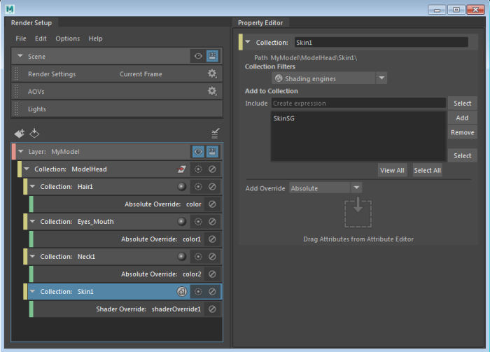 A collection named ModelHead_shadingEngines is created, along with a corresponding shader override. Select this collection to see that the Collection Filters is set to Shading engines. This collection contains all the shading engines applied to the head model.