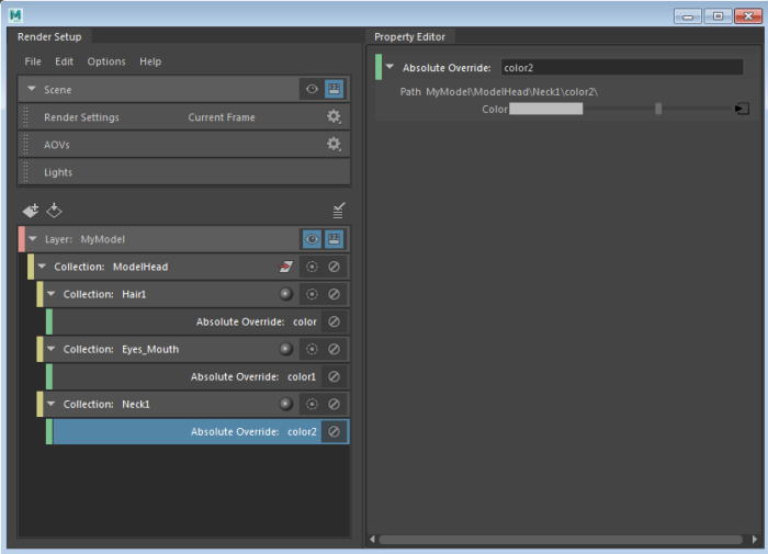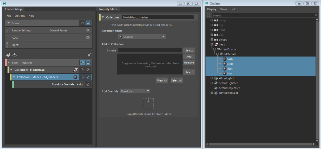 A ModelHead_shaders sub-collection is created, along with a corresponding color override. As before, all of the Skin, Hair, Neck, and Eyes shaders are included in this collection.
