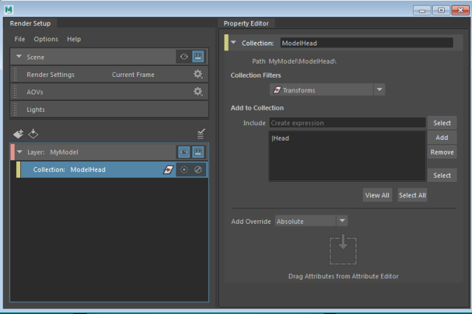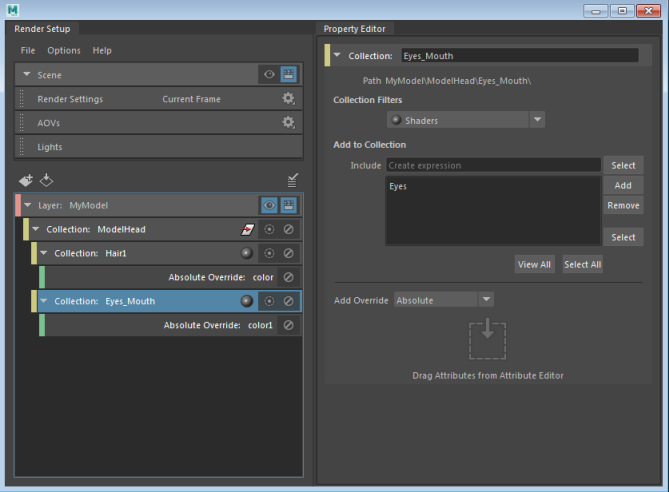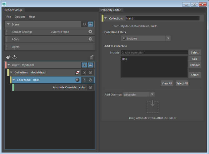 A ModelHead_shaders sub-collection is created, along with a corresponding color override. Select this collection to see that the Collection Filters is set to Shaders in the Property Editor.