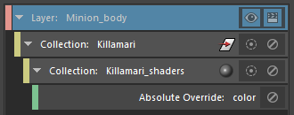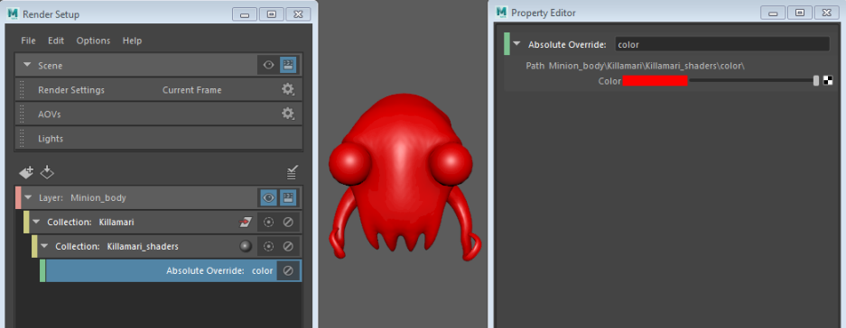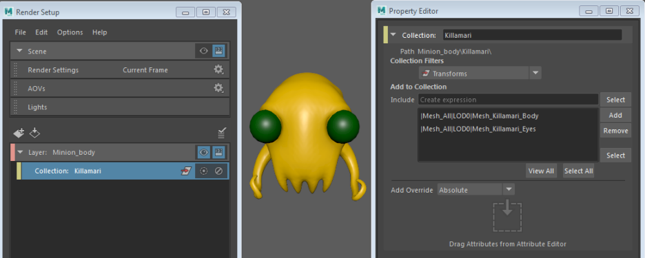To begin this example, Mesh_Killamari_Body has a blinn7 (orange color) applied, and Mesh_Killamari_Eyes has a phong1 (green color) applied. A render layer Minion_body has been created, with a collection named Killamari.