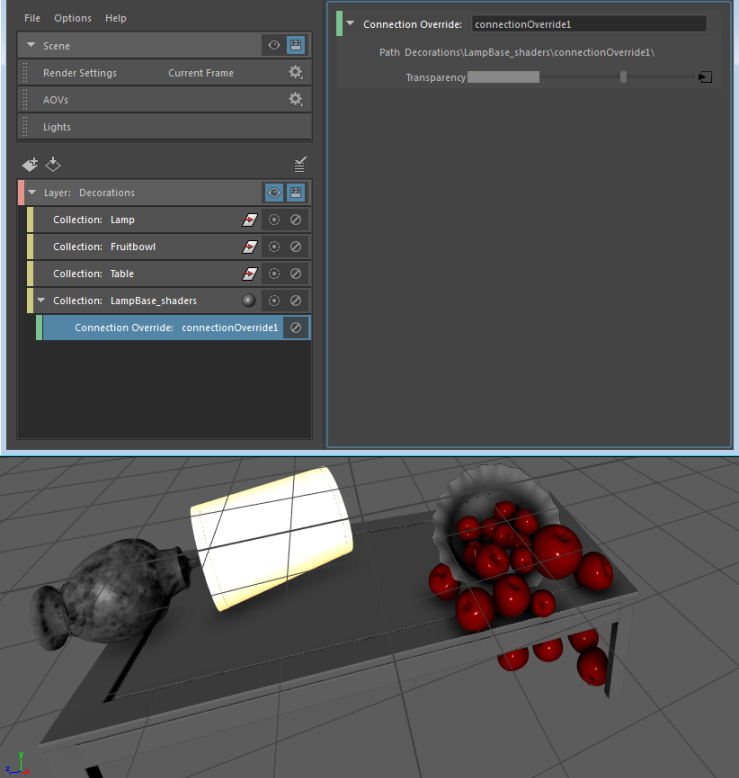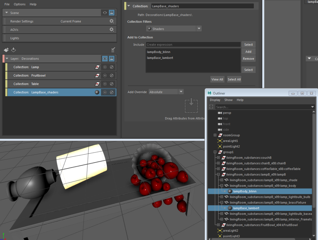 Connection overrides are applied to all shaders in the collection; for example, in this case: lampBody_blinn and lampBase_lambert in the LampBase_shaders collection. If the fruit bowl also had been assigned either the lampBody_blinn or lampBase_lambert shader, it would have the transparency override applied, even though the original intention may have been to override only the transparency of the lamp. It is therefore worthwhile to verify the shaders applied to the each object in your layer to avoid inadvertently overriding the shader of an object. To do this, select Display > Assigned Materials in the Outliner.