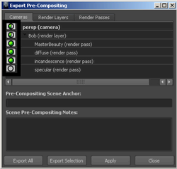 The Export Pre-compositing editor is divided into three tabs: Cameras, Render Layers, and Render Passes. Select the appropriate tab depending on the elements that you want to export.