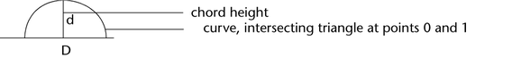 Takes the ratio between the chord height (d) and the Distance (D) between the two points where the triangle intersects the surface, and subtracts it from 1, as shown in the equation: