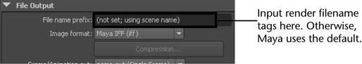 The following rendered image filename options and tokens can be combined to create subfolders and custom image names for rendered images. Enter these options in the File Name Prefix field of the Render Settings: Common tab.