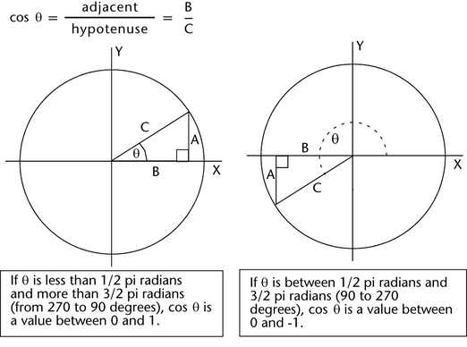 Returns the cosine of an angle specified in radians.