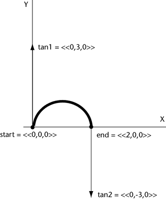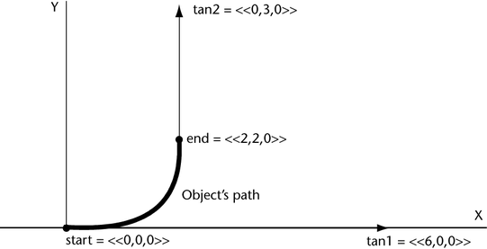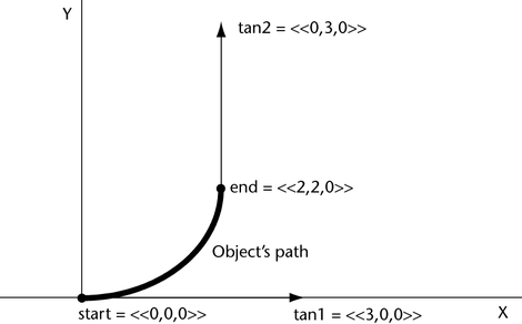 When you play the animation, the object moves from the start point <0,0,0> along a curve to the end point <2,2,0>. The tangent vector <3,0,0> sets the curve’s direction and shape as it leaves the start point. The tangent vector <0,3,0> sets the curve’s direction and shape as it approaches the end point.