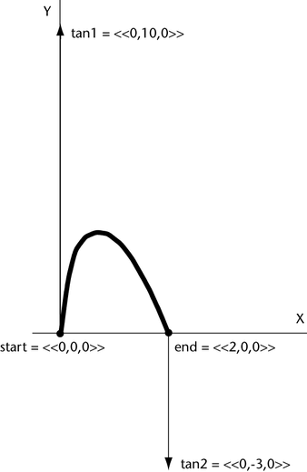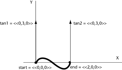 Because of the longer tan1 vector, the slope of the path curve steepens as it rises from the start point. Because the tan2 vector has a smaller Y magnitude than the Y magnitude of the tan1 vector, the slope of the path curve is flatter as it approaches the end point. The curve’s rise in the Y direction is greater than the previous example because the magnitude of tan1’s Y component is larger (10 instead of 3).