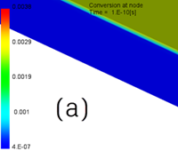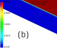 Figure 2: Section showing the degree of cure at the end of preconditioning, where the heat transfer coefficient on the bottom surface was set to (a) 5,000, and (b) 500,000