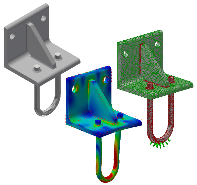 In this tutorial, we complete a linear static stress analysis of a welded steel hanger to which a 6000 N downward load is applied. The weld beads are included in the CAD model as a separate multi-body part so that the stresses in the welds can be determined. Suppress contact between adjacent parts so that only bonding at the part-to-weld interfaces is considered. Fully fix the two mounting hole surfaces in the vertical leg of the angle. Add a constraint against translation in the X-direction to the bottom corner edge of the angle to represent the support of the wall to which the hanger is bolted. The surface of the U-Rod has been split in the CAD model to provide a partial surface for application of the downward force.
