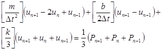 value in each expression for the solution. We will represent the displacement at the current time as the average over the adjacent times. Likewise the load can be averaged over three steps, the difference being that we know