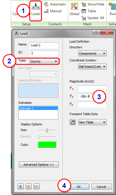We will use two subcases to control the time step size. In the first subcase, we will assign a very small time step to capture the descent and impact of the ball. In the next step, we will create a second subcase with a larger time step to capture the motion of the ball as it rebounds off of the plate.