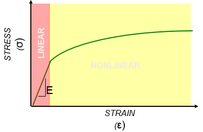 Material nonlinearity is a concern whenever the response at the operating loads causes strain levels in a material beyond the portion of the stress-strain curve that can reasonably be approximated as linear. Many materials have curves that deviate small amounts from linear for large amounts of strain so that, with all the other uncertainty in the model, there would be little value in a nonlinear material model. On the other hand, many curves deviate from linear almost immediately to such a degree that only the roughest trend studies can be made with a linear approximation.