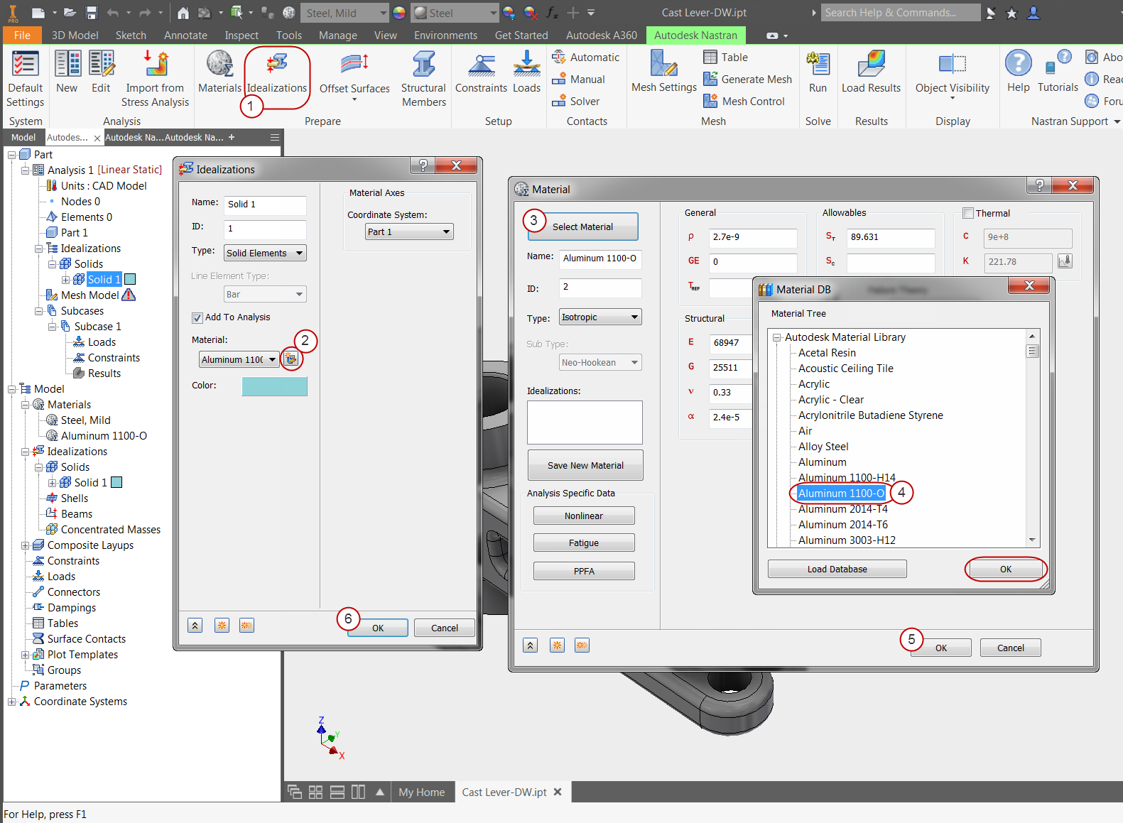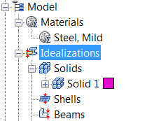 In the Model tree, expand the Idealizations node to check for any existing definitions, such as Solid 1. If any exist, right-click . Doing this ensures that you won't have unwanted materials appearing in the part mesh and the analysis.
