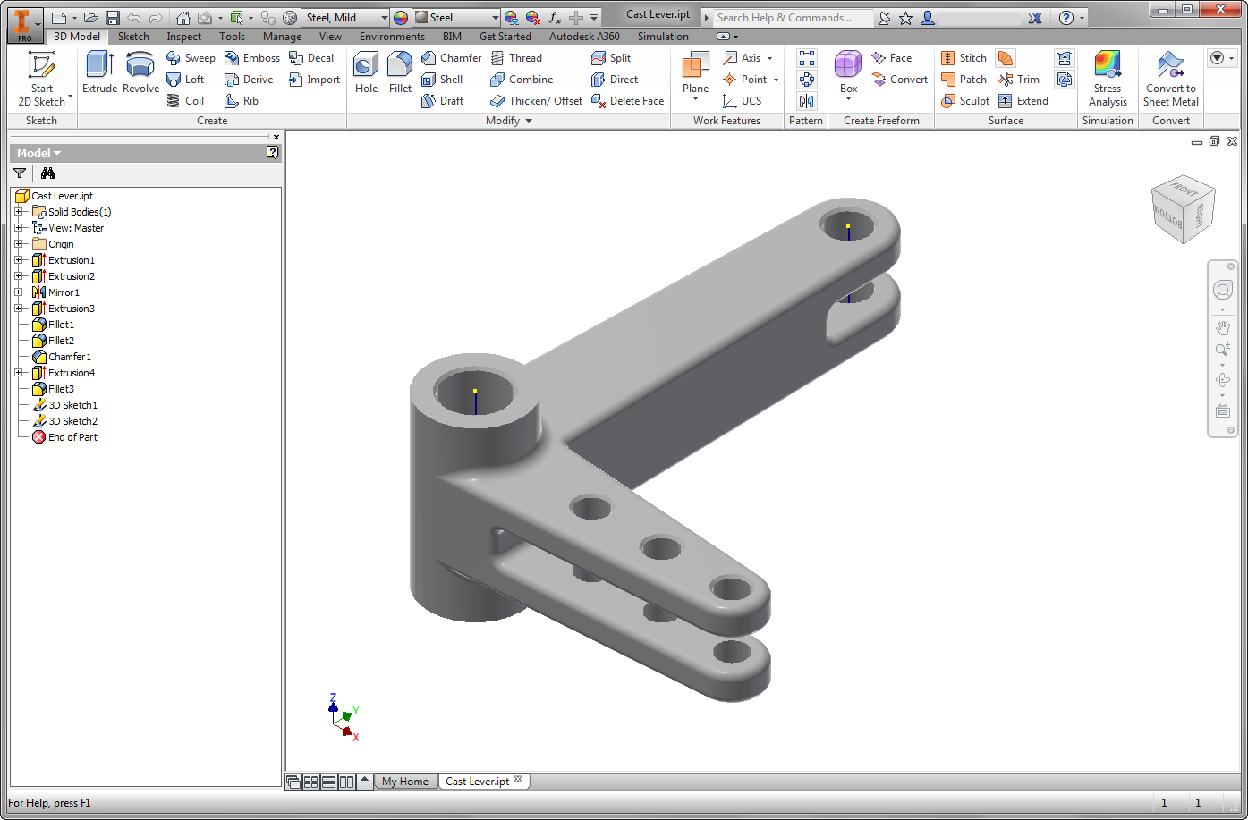 Start Autodesk Inventor, and open Cast Lever.ipt from the Section 5 - Cast Lever sub-folder of your training exercises folder. (Get Started > Launch > Open).