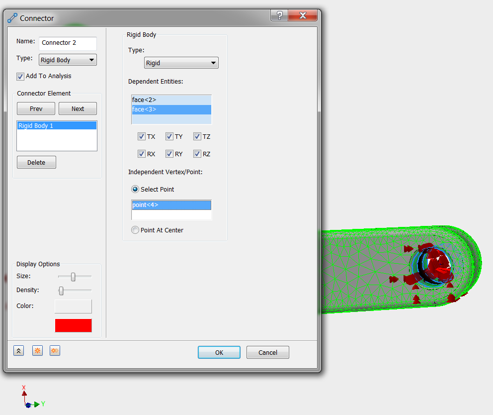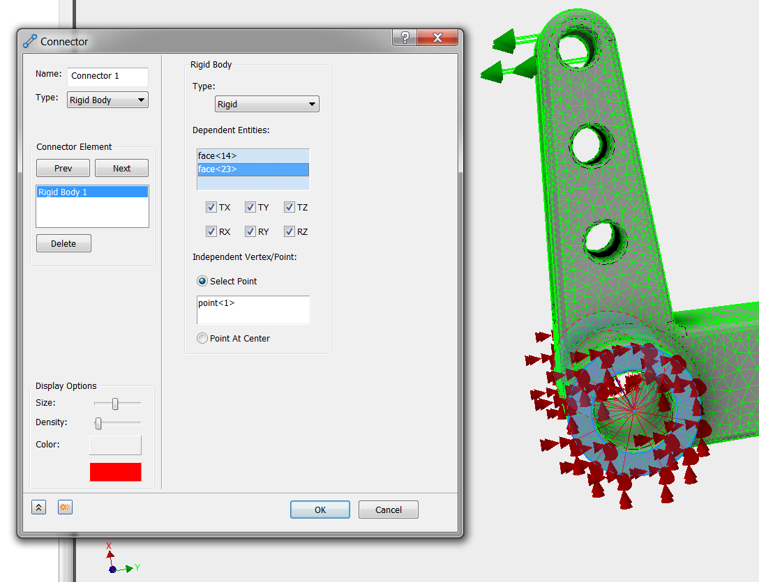 Repeat the procedure to create the ball joint constraint on the small hole. For the Independent Vertex, select the reference point on the axis. For the Dependent Entities, select the inner diameter surface from each hole, as shown: