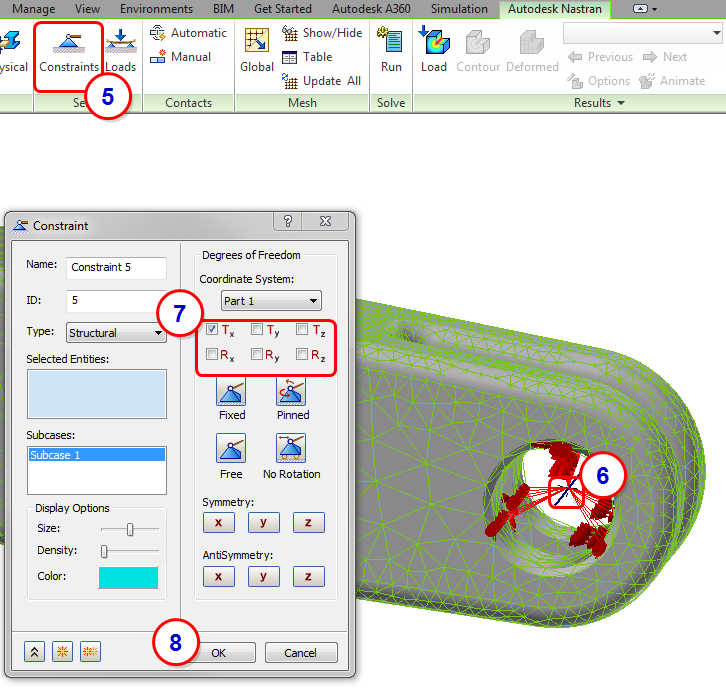 A commonly used technique in FEA is the 'ball joint' constraint to control rotations. The ball joint constraint uses rigid elements to control a reference point. The rigid elements are often called 'spokes' or 'spider webs', given their appearance. We tie the movement of an edge or surface to a reference point to allow for more natural movement. In Autodesk Inventor Nastran, this is done with a Rigid Connector:
