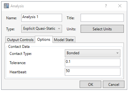 4. In the Analysis dialog, click the Options tab, and under Explicit Quasi-Static Step, ensure that the Heartbeat value is 50.