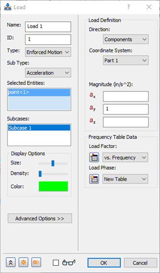 With enforced motion loads (displacement, velocity, and acceleration), the direction that is desired to be enforced must be constrained. This may seem awkward, but just remember that enforced motion is constrained motion.