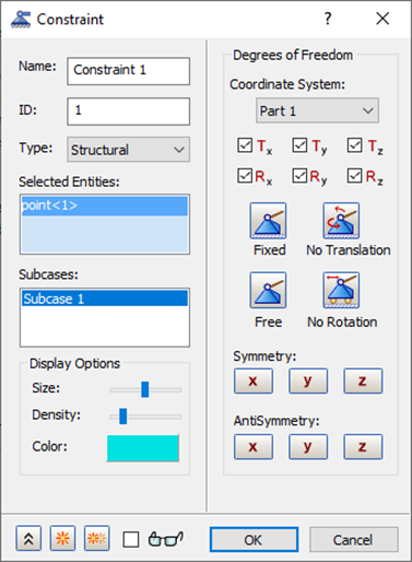 - Select the point at the base of the model to be fixed in all 6 degrees of freedom.