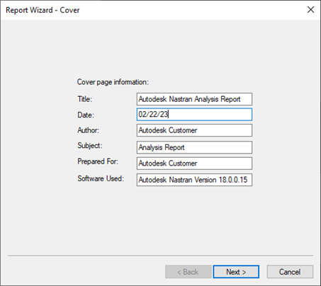 Report Wizard – Cover window opens. Edit the following information: