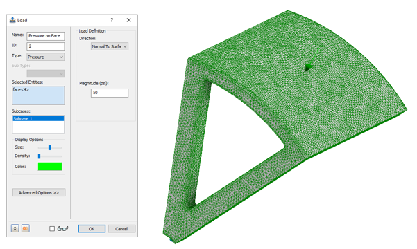 New. In this subcase, the load is a 50 psi pressure applied to the outer surface of the wheel in the direction normal to the surface.