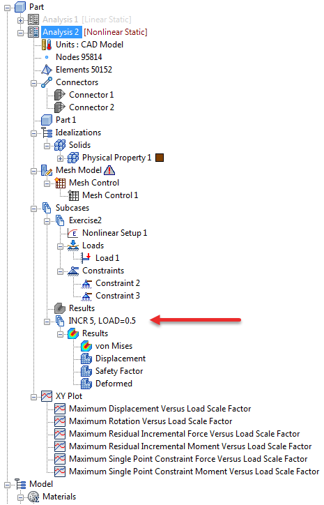 Load and Display Intermediate Results: This option works in conjunction with Generate Intermediate Results and thus, is only available when that option is checked. The incremental results are automatically loaded into the tree under Subcases and can be viewed until the next increment has been solved. This is shown in the example below.