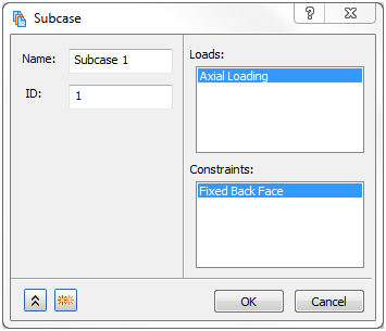Loads and constraints can be selected from their respective area to be added to the subcase, as shown in the picture below.