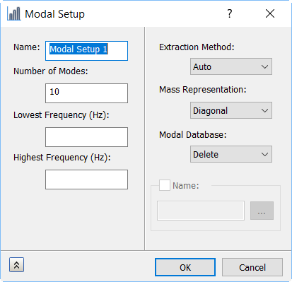 To set these up, in the Part tree, under your Subcase, right-click Dynamics Setup, Modal Setup, or Quasi-Static Setup and select Edit. Settings for Quasi-Static Setup are the same as shown below for Dynamics Setup, except that the default Name is Quasi-Static Setup.