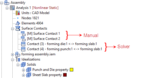 OK, the highlighted contact pairs will be added to the current analysis, and the non-highlighted entries will be removed from the Analysis (if they were in it). This tool will not delete contact pairs from the Model branch of the tree. In the following image, the two manual surface contact pairs that were selected in the preceding dialog have been added to the Analysis.