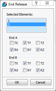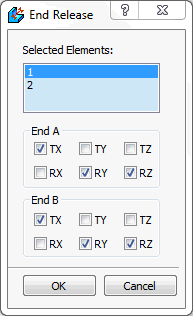 - End Release: End release is supported for line elements. Beam element has 6 DOF, there are special situations like rotating shaft or hinge joint where rotation or translation in a specific direction is free. End release is a special command to release one or more DOF of beam.
