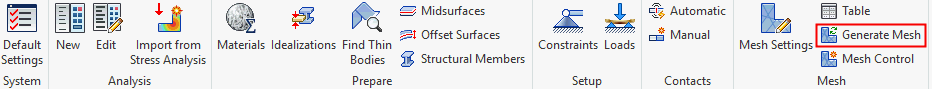 Click Generate Mesh in the Mesh panel on the Inventor Nastran ribbon tab or right-click on Mesh Model and select Generate Mesh.