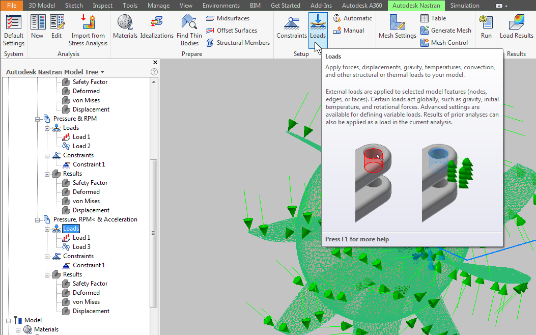 You can use the Ribbon bar to quickly setup, run, and evaluate the results of analyses in Autodesk Inventor Nastran as follows: