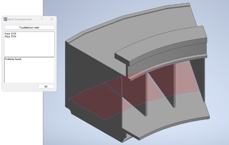 Running the mesh troubleshooter offers insights into potential issues with the CAD model from a meshing standpoint. When you select entities in the top section, the corresponding entity is highlighted in the canvas, complete with a tooltip for additional information.