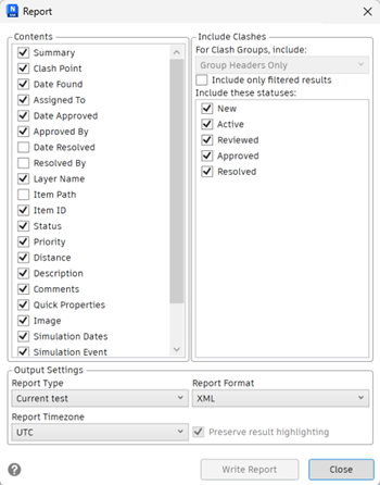 The Report window enables you to set up and write reports containing details of all clash results found in the selected test.